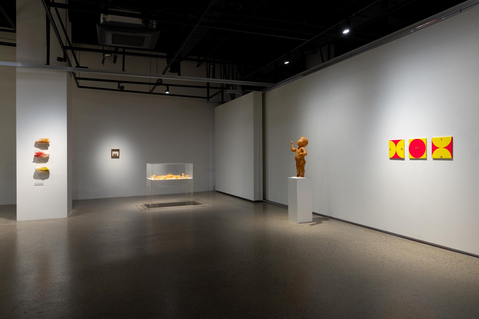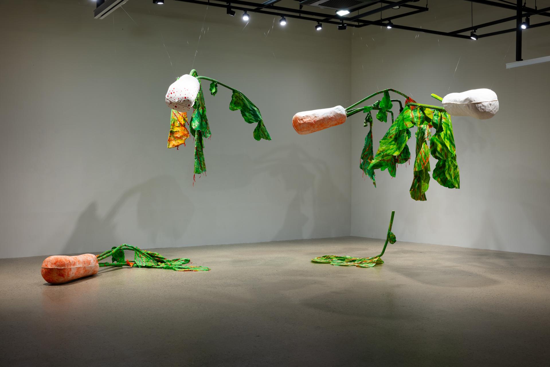 밥상 위 먹거리라는 소재만 놓고 보면 한국인 여성 작가로서 정체성의 발현으로 이어지는 진지한 작업을 연상하기 쉽다. 그러나 갤러리 천장에 매달린 대형 조형 작품〈날으는 총각김치〉를 마주하는 순간, 미학적 기대는 곧 유쾌한 감상으로 전환된다. 밥상에 얽힌 개인 혹은 집단의 기억과 무수한 서사를 품은 김치라는 이미지가 곧 경쾌하고 키치한 색감을 입고 어디서든 쉽게 수용 가능한 하나의 팝 아이콘으로 변모하는 지점이다.